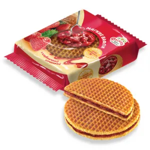 ТУ 10.72.12-009-32868421-2024. Состав: мука пшеничная высшего сорта, сахар, начинка фруктово-ягодная «Клубника» (сахар, пюре яблочное, патока, вода, загуститель пектин, клубничное пюре, регулятор кислотности лимонная кислота, ароматизатор «Клубника», краситель кармин, консервант сорбат калия, стабилизатор цитрат кальция, регулятор кислотности цитрат натрия), маргарин (рафинированные дезодорированные растительные масла в натуральном и модифицированном виде (пальмовое, подсолнечное, соевое), вода, эмульгатор моно- и диглицериды жирных кислот, соль, регулятор кислотности лимонная кислота, ароматизатор, краситель бета-каротин, антиокислители: аскорбиновая кислота, альфа-токоферол), продукты яичные, соль, эмульгатор подсолнечный лецитин, разрыхлитель гидрокарбонат натрия, ароматизатор, краситель бета-каротин. Пищевая ценность (100 г): белки - 4,5 г; жиры - 10,5 г; углеводы - 67,0 г.