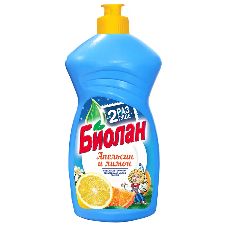 Моющее средство для посуды Биолан эффективно удаляет жир, хорошо пенится и легко смывается водой, не оставляя разводов и придавая посуде блеск.