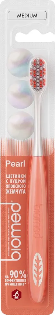 Зубная щетка BIOMED Pearl white Medium – это улучшенное удаление зубного налета. Микроскопическая структура жемчуга в составе щетина способствует удалению налета и стойких пятен. Легкое и быстрое очищение благодаря специальной форме головки зубной щетки. Натуральный минеральный комплекс: жемчуг содержит минералы, которые укрепляют зубную эмаль.