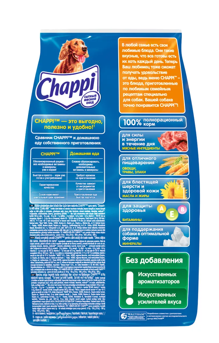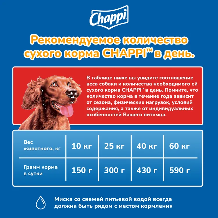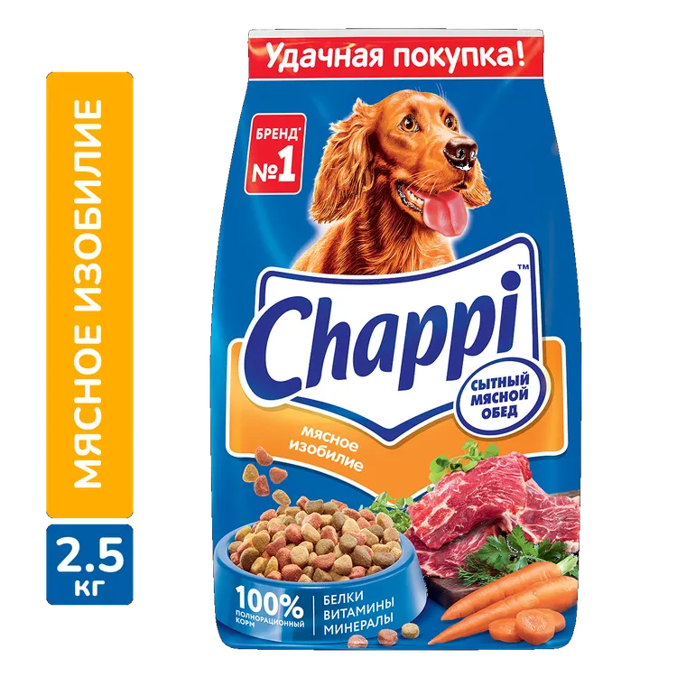 Полнорационный сухой корм Chappi сытный мясной обед "Мясное изобилие" разработан специально для ежедневного питания, подходит для всех пород собак. В составе продукта имеется мясо, крапива и ромашка, масла и жиры, позволяющие вашему питомцу выглядеть здоровым и счастливым. Содержит натуральные и полезные ингредиенты - приправу из овощей и трав. Поможет сохранить вашему животному прекрасную форму. Позволяет обеспечить сбалансированным питанием вашего домашнего любимца. Полнорационный сухой корм для взрослых собак всех пород. Новое вкусное меню от Чаппи станет любимой едой вашей собаки. Выбирая полноценное сбалансированное питание Чаппи для Вашего любимца, вы можете быть уверены в том, что каждый день ваша собака будет довольной, игривой и здоровой. Вкусно и Полезно! -Для силы и Энергии в течение дня - Мясо. -Для отличного пищеварения - Овощи, Травы, Злаки. -Для блестящей шерсти и здоровой кожи - Масла и Жиры. -Для крепких зубов и костей - Кальций. -Для защиты здоровья - Витамины. -Для поддержания собаки в оптимальной форме - Минералы. -Не содержит Искусственных ароматизаторов, Искусственных усилителей вкуса.