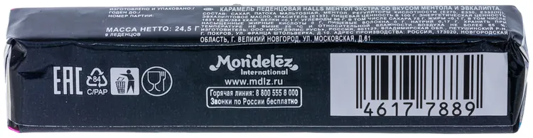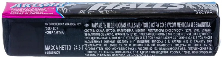 Состав: Сахар, патока мальтозная, ментол, регуляторы кислотности (Е270, Е330, Е332(ii)), эвкалиптовое масло, краситель (Е133).