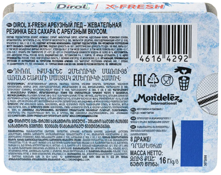 Dirol X-Fresh "Арбузный лед" - популярная жевательная резинка. Обладает ярко выраженным долгим неугасаемым вкусом. В пачке 8 подушечек.