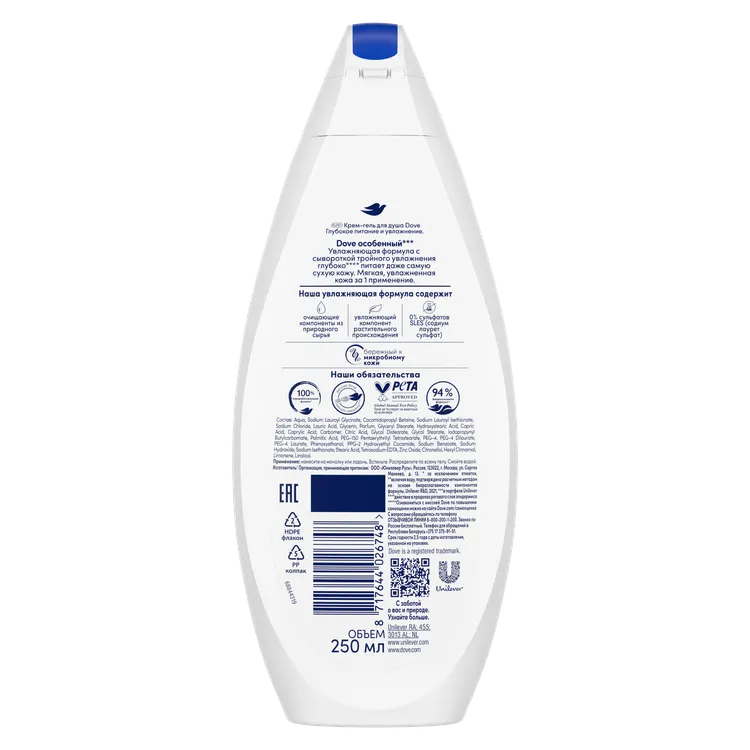 Крем-гель для душа Dove не содержит сульфатов (0% сульфатов SLES - содиум лаурет сульфат), а увлажняющая формула с бережным отношением к микробиому кожи обеспечивает мгновенную мягкость** и длительный уход***. Увлажняющая формула крем-гелей для душа Dove содержит очищающие компоненты из природного сырья и увлажняющий компонент растительного происхождения. Dove не тестирует на животных во всем мире.