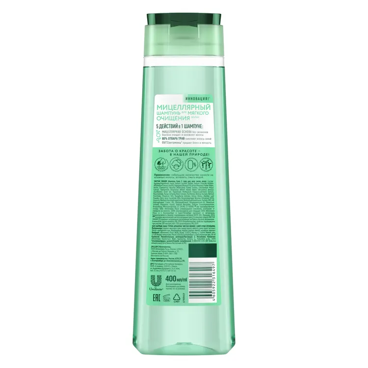 Мицеллярный шампунь создан для мягкого очищения волос без сухости, 5 действий в 1 шампуне. Мицеллярная основа бережно очищает и увлажняет волосы, не повреждая даже истонченные кончики длинных волос, полезная формула 80% отвара трав наполняет волосы силой, ФИТОвитамины придают блеск и мягкость