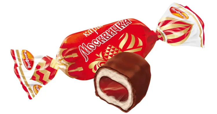 Легендарная конфета «Москвичка» фабрики «Рот Фронт» – это хрустящая белая карамель, покрытая шоколадной глазурью. Внутри конфеты – нежная помадная начинка с добавлением какао, сгущенного молока и терпким коньячным ароматом. Вкус, знакомый многим поколениям, сочетание твердой карамели и тающей мягкой начинки.