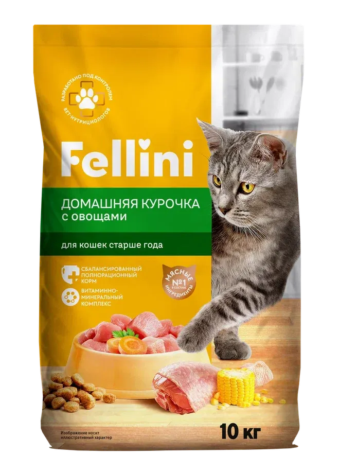 СУХОЙ КОРМ ДЛЯ КОШЕК FELLINI С ДОМАШНЕЙ КУРОЧКОЙ И ОВОЩАМИ 10КГ