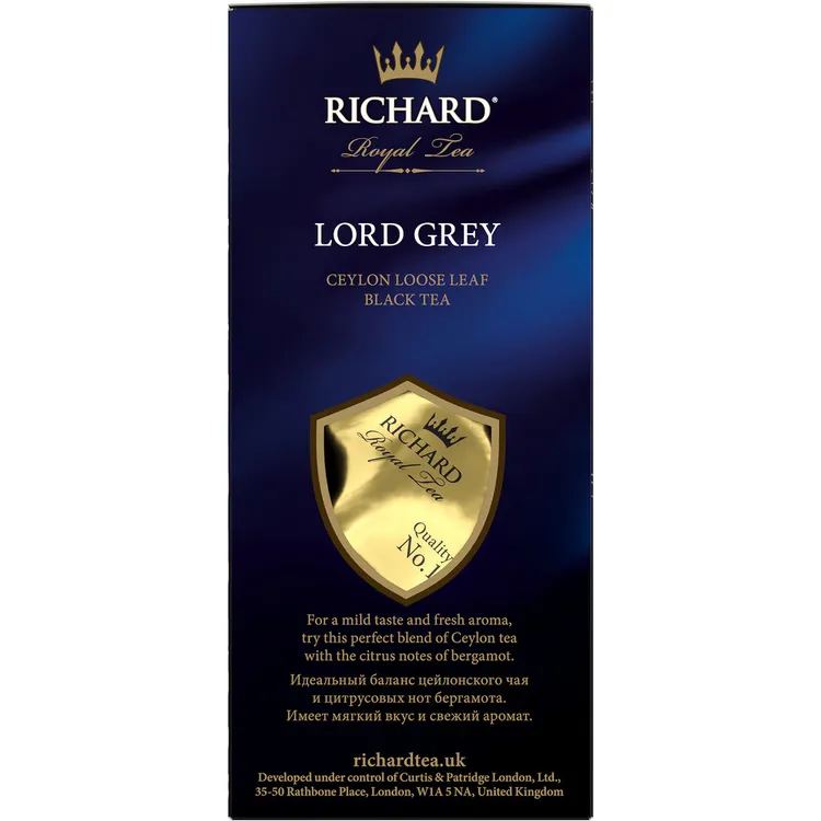 Листовой черный чай Richard Lord Grey - это идеальный баланс цейлонского чая и свежих цитрусовых нот бергамота. Имеет мягкий вкус и среднюю терпкость. Превосходно тонизирует и снимает усталость.
