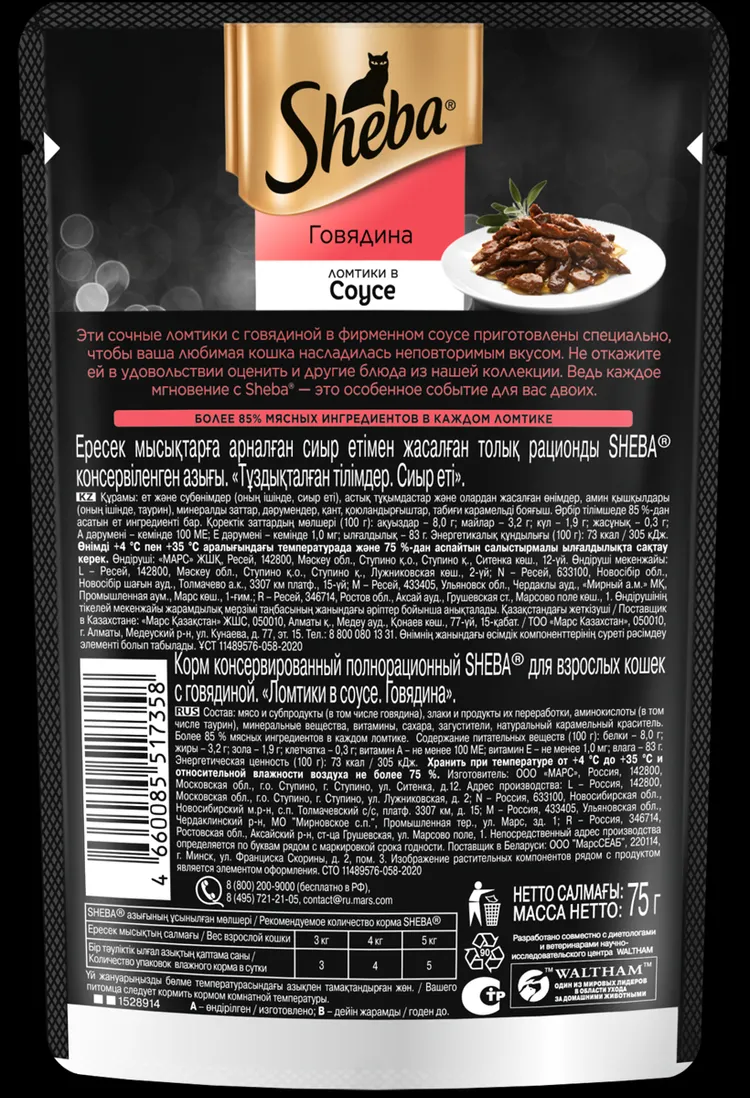 Сочные ломтики с говядиной в фирменном соусе - блюдо из высококачественных ингредиентов, которое придётся по вкусу самым притязательным кошкам. Мы приготовили его по особому рецепту, чтобы раскрыть всю красоту вкуса и сохранить баланс витаминов, минералов и аминокислот, необходимых вашей любимице. Подарите своей кошке особое удовольствие, побаловав ее всеми блюдами из коллекции SHEBA.