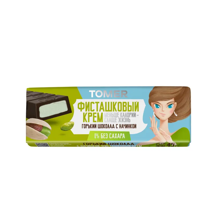БАТОНЧИК ГОРЬКИЙ ШОКОЛАД С НАЧИНКОЙ ФИСТАШКОВЫЙ КРЕМ 55ГР ТОМЕР