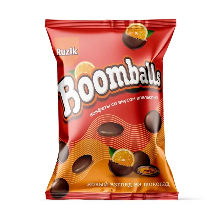 BOOMBALLS КОНФЕТЫ В МОЛ ШОК С ХРУСТ ШАРИКОМ И МОЛ НАЧИН СО ВКУС АПЕЛЬСИНА 60ГР