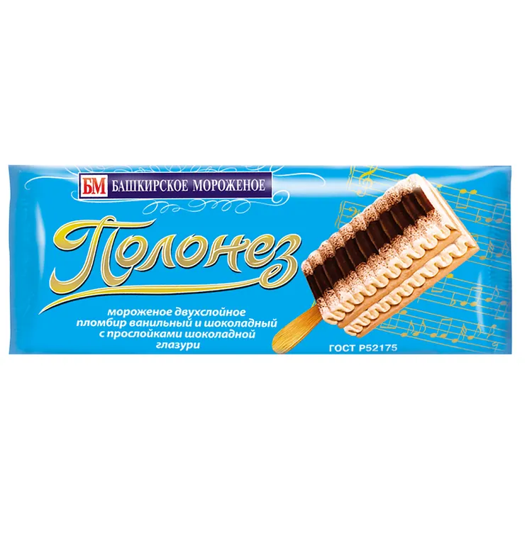 Мороженое БАШКИРСКОЕ МОРОЖЕНОЕ Полонез пломбир ванильный и шоколадный с прослойками шоколадной глазури, без змж, эскимо, 65г*32шт