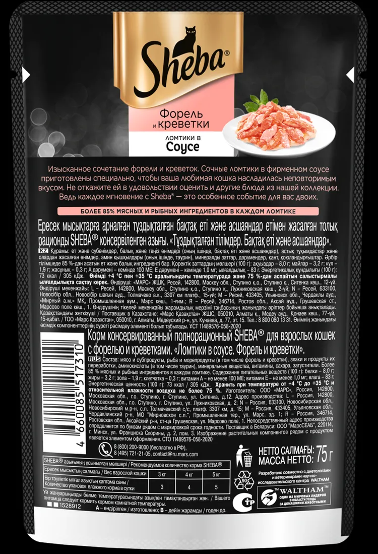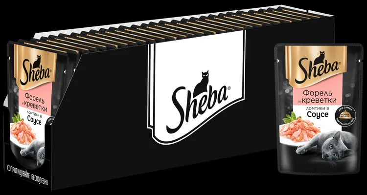 Ломтики с нежной форелью и ароматными креветками в фирменном соусе - блюдо из высококачественных ингредиентов, которое придётся по вкусу самым притязательным кошкам. Мы приготовили его по особому рецепту, чтобы раскрыть всю красоту вкуса и сохранить баланс витаминов, минералов, ОМЕГА-6 жирных кислот и аминокислот, необходимых вашей любимице. Подарите своей кошке особое удовольствие, побаловав ее всеми блюдами из коллекции SHEBA.