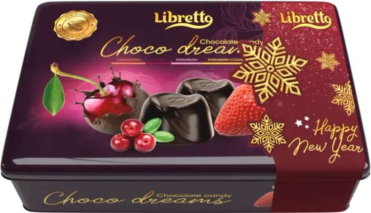 Набор шоколадных конфет в жестяной коробке в темном шоколаде с фруктовыми начинками: "Варенье клюква", "Варенье вишня", "Варенье клубника", "Варенье Клубника" с коньяком 200 гр