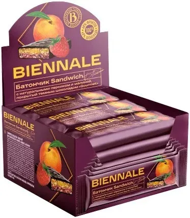 ФРУКТОВО-ЯГОДНЫЙ БАТОНЧИК BIENNALE В ТЕМНОМ ШОКОЛАДЕ SANDWICH ПЕРСИК-МАЛИНА 40ГР