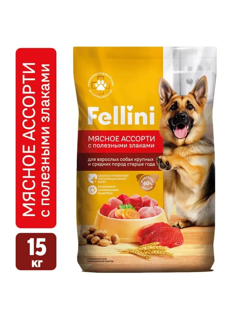 СУХОЙ КОРМ ДЛЯ СОБАК СРЕД. И КРУПНЫХ ПОРОД FELLINI МЯСНОЕ АССОРТИ 15КГ