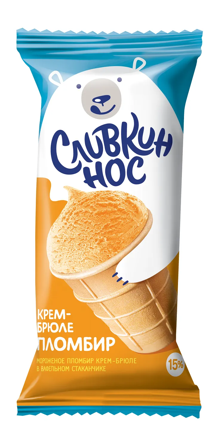 Кремовый пломбир из натуральных сливок со вкусом крем-брюле в вафельном стаканчике. Пищевая ценность средние значения в порции 100 г: