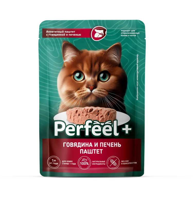 КОРМ ВЛАЖНЫЙ PERFEEL+ ДЛЯ КОШЕК ПАШТЕТ С ГОВ. И ПЕЧ .28*75Г.
