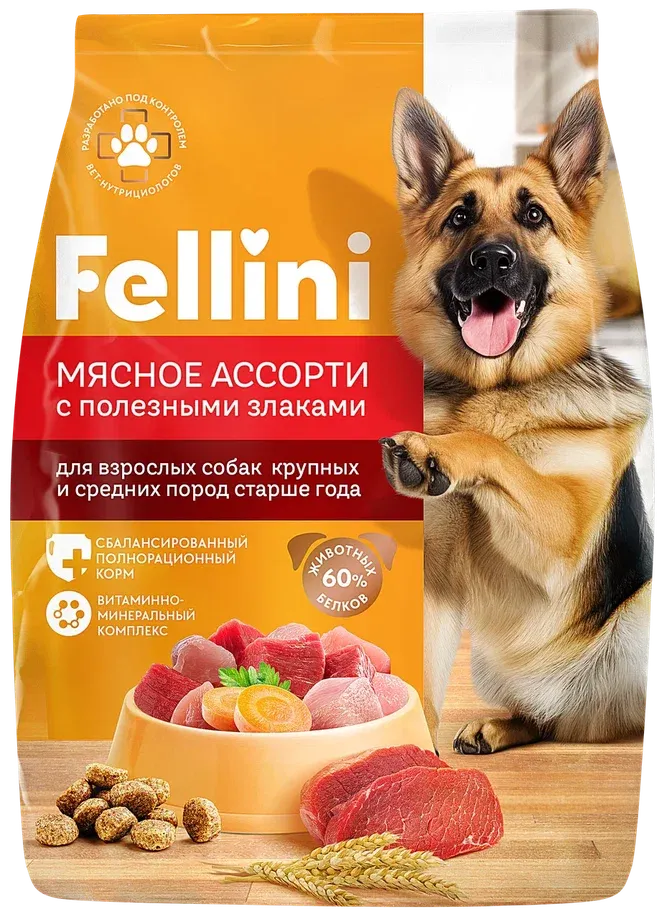 СУХОЙ КОРМ ДЛЯ СОБАК СРЕД. И КРУПНЫХ ПОРОД FELLINI МЯСНОЕ АССОРТИ 4*600ГР