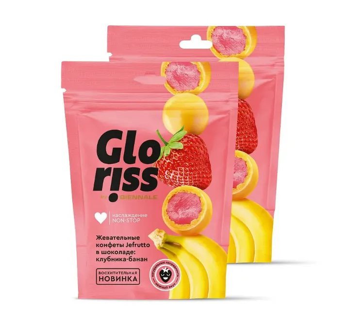 ЖЕВАТЕЛЬНЫЕ КОНФЕТЫ GLORISS В ШОКОЛАДЕ СО ВКУСОМ КЛУБНИКА-БАНАН 75ГР*16ШТ