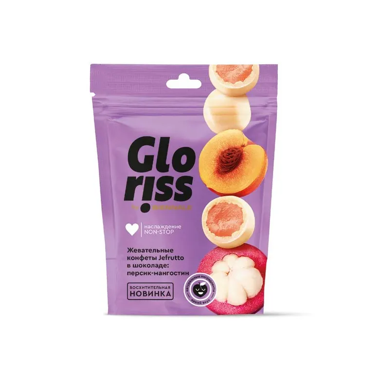 ЖЕВАТЕЛЬНЫЕ КОНФЕТЫ GLORISS В ШОКОЛАДЕ СО ВКУСОМ ПЕРСИК-МАНГОСТИН 75ГР*16ШТ