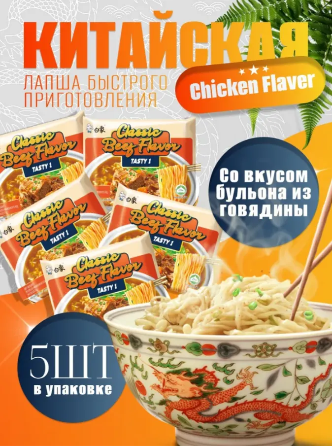 БАЙСЯН ВКУСНО ЛАПША Б/П КЛАССИЧЕСКАЯ СО ВКУСОМ КУРИНОГО СУПА, 82Г/5ШТ, ХАЛЯЛЬ, КИТАЙ