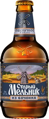 ПИВНОЙ НАПИТОК "СТАРЫЙ МЕЛЬНИК ИЗ БОЧОНКА ПШЕНИЧНОЕ ЖИВОЕ" НЕФИЛЬТРОВАННЫЙ ОСВЕТЛЕННЫЙ ПАСТЕРИЗОВАННЫЙ, 4,9%, СТЕКЛЯННАЯ БУТЫЛКА 0,45 Л